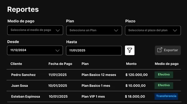 Genera reportes completos para analizar el desempeño del gimnasio. Consulta Ingresos por pagos, y actividad de los miembros, todo en un formato claro y fácil de interpretar.